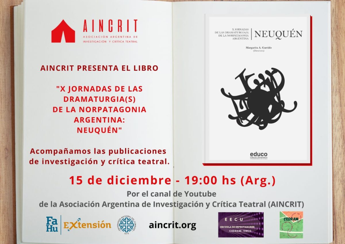 AINCRIT organiza la primera presentación del Ciclo: AINCRIT PRESENTA, en el que acompañaremos diferentes publicaciones de investigación y crítica Teatral. En esta oportunidad les invitamos a la presentación del libro “Actas X Jornadas de Dramaturgia(s) de la Norpatagonia Argentina: Neuquén» que se realizará el día miércoles 15 de diciembre a las 19 hs. (Arg.) y al que podrán asistir a través de nuestro canal de YouTube