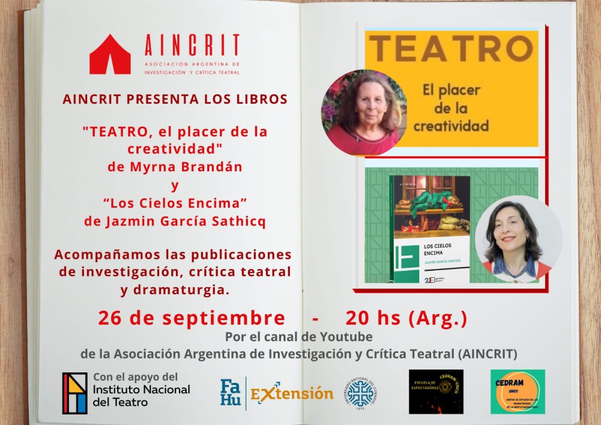 Lxs invitamos a la presentación de los libros: «TEATRO. El placer de la creatividad» de Myrna Brandán y «Los cielos encima» de Jazmín García Sathicq , en el marco de nuestro ciclo AINCRIT PRESENTA.