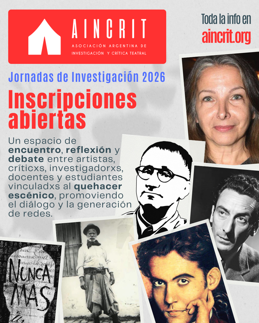 La Asociación Argentina de Investigación y Crítica Teatral (AINCRIT) invita a participar de las XVII Jornadas Nacionales y XII Jornadas Latinoamericanas de Investigación y Crítica Teatral, que se realizarán en modalidad híbrida (presencial y virtual), entre el lunes 4 y el viernes 8 de mayo de 2026.