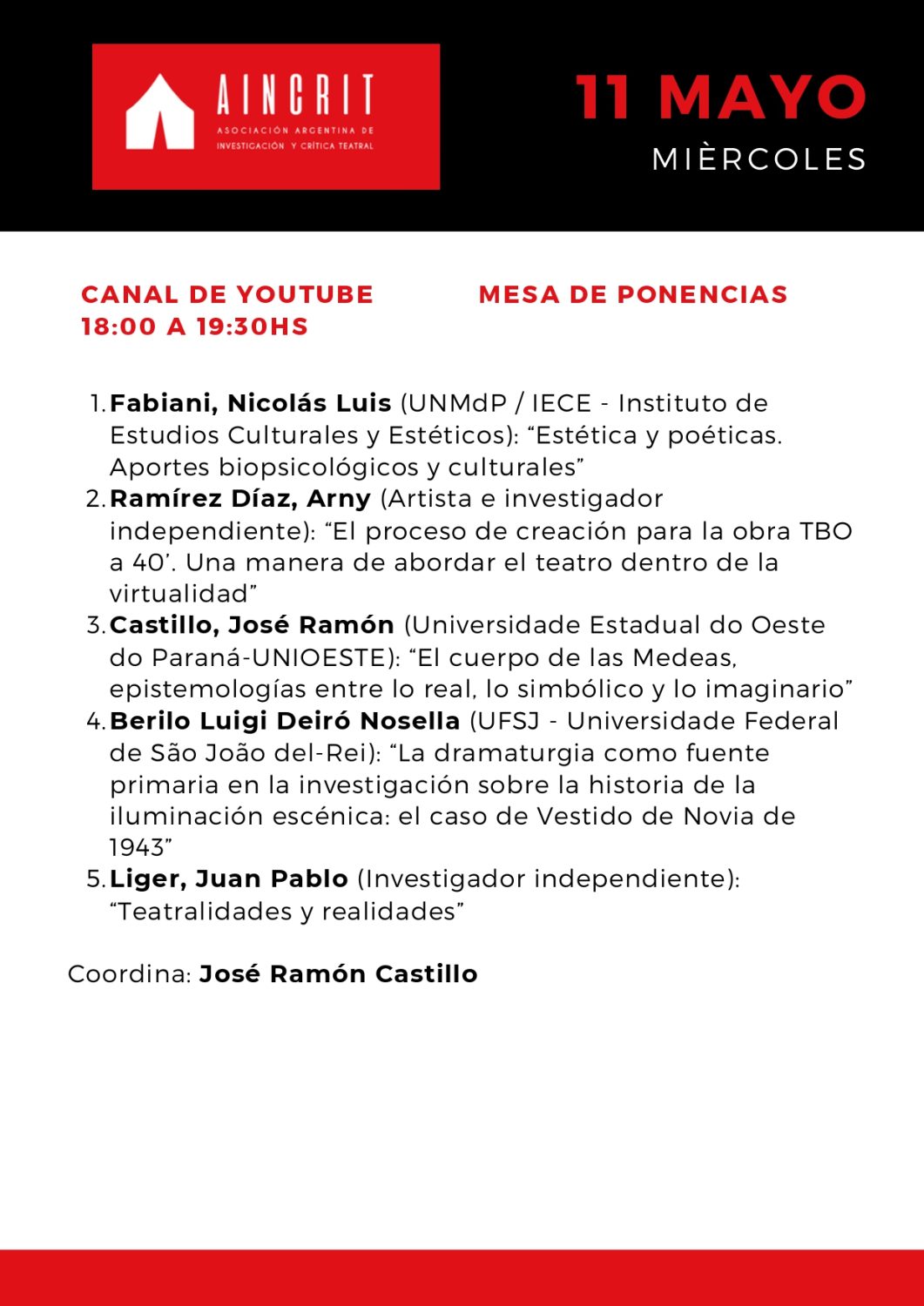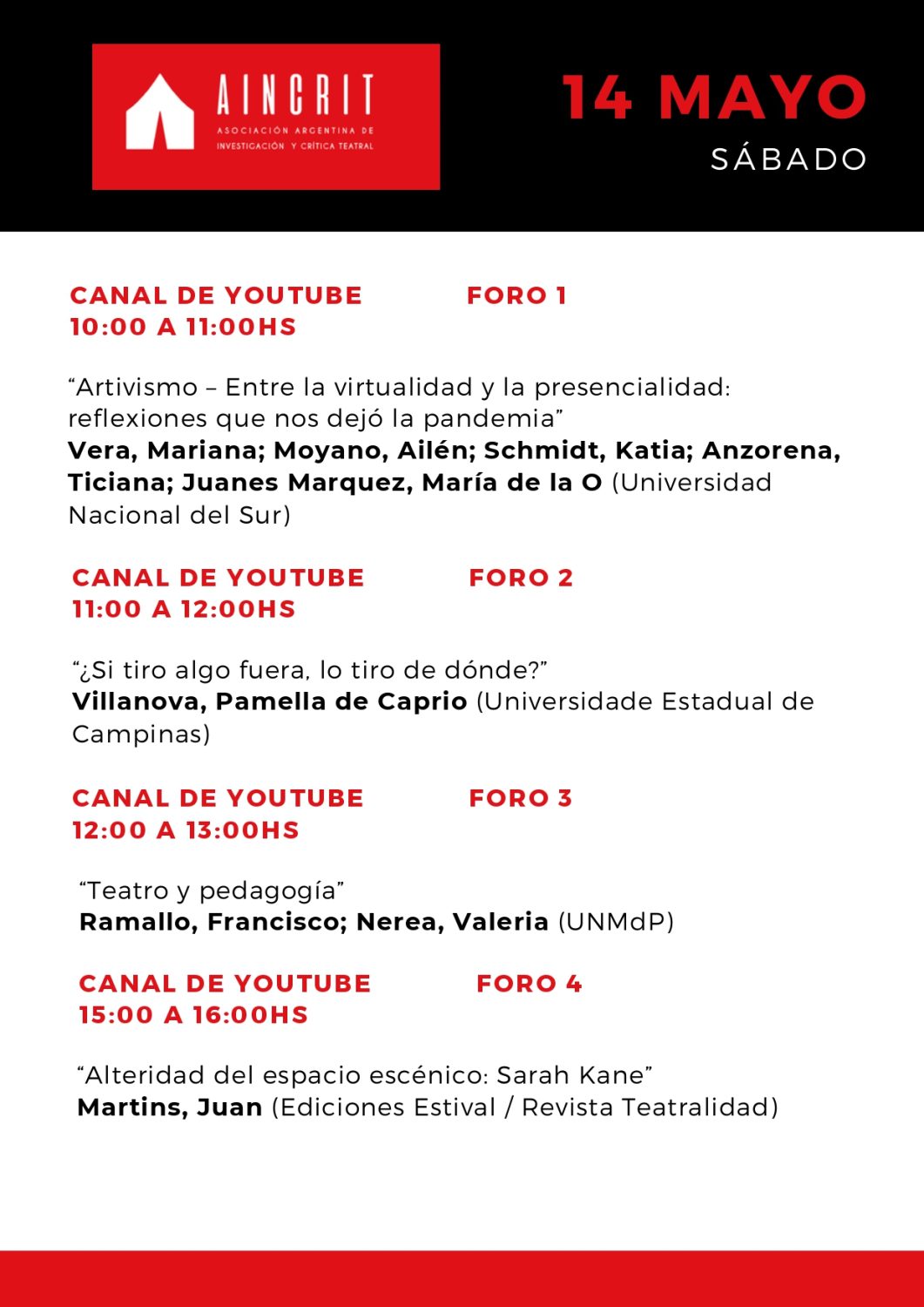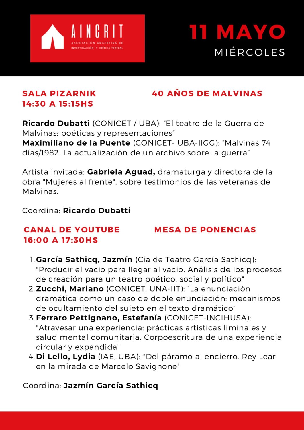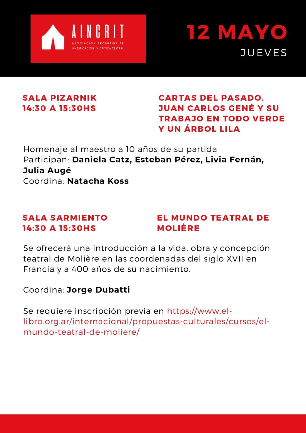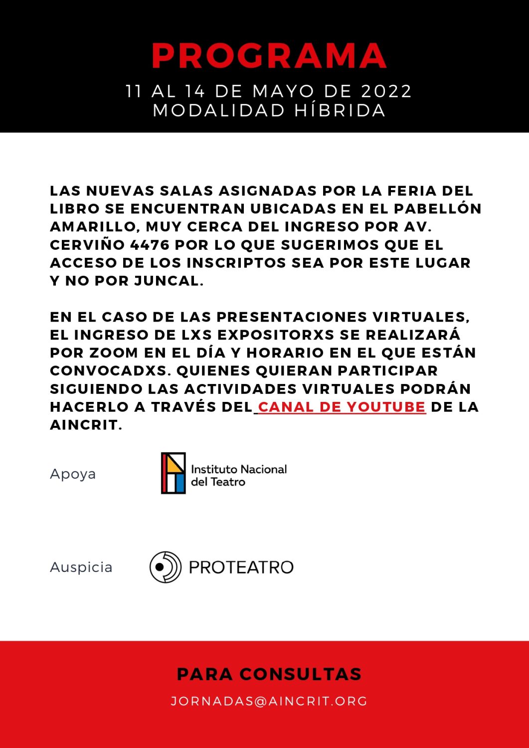 Compartimos el programa de las Jornadas de Investigación y crítica teatral que tendrán lugar del 11 al 14 de mayo en el marco de la Feria Internacional del Libro. La modalidad es híbrida (presencial y virtual)